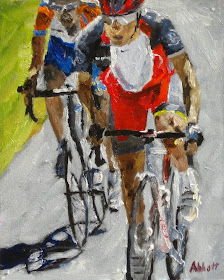 Stage 3 of the 2010 ATOC was just as decisive as expected. It ended with the final podium crossing the finish line together. This painting is from a crop of a Jonathan Devich photo of Levi and DZ. I was after capturing the intense sunshine especially through the shadow on the pavement. Most of the finish photos of the stage are overexposed from the bright pavement and capture a great moment where DZ almost loses to a bike throw. I most remember the moist rain forest climbs and California coastlines from that day, so there are a lot of choices to sum up the stage.